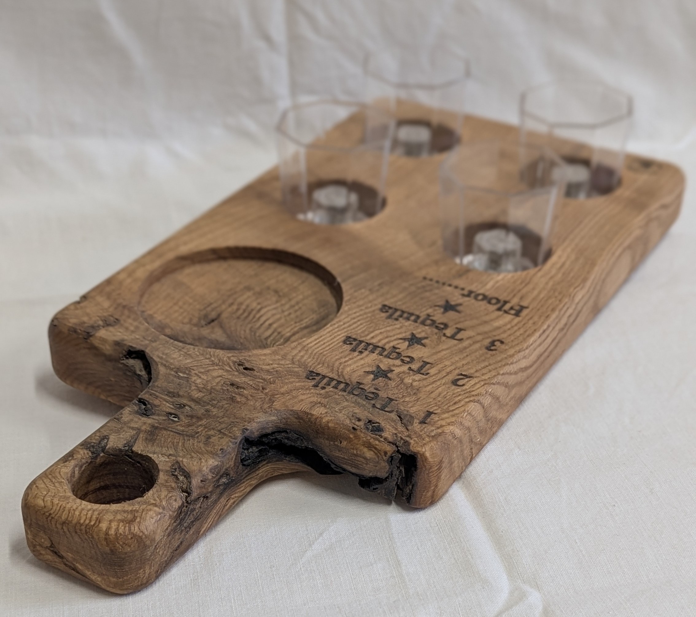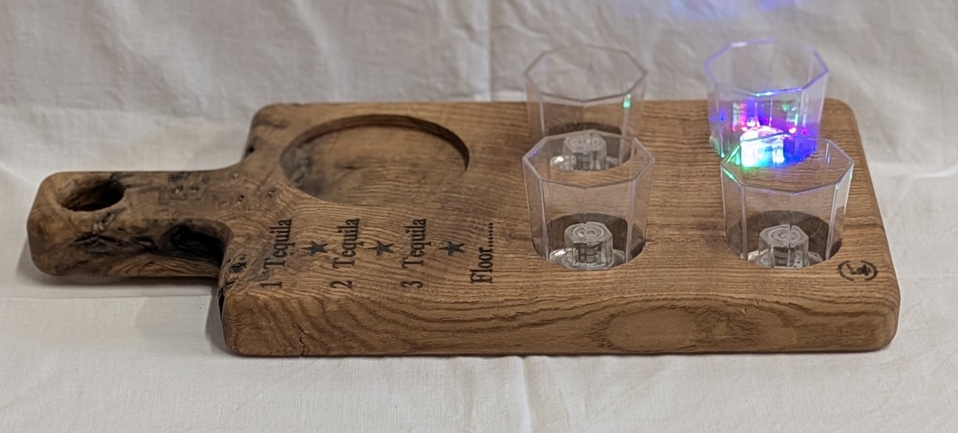 1 Tequila, 2 Tequila, 3 Tequila, Floor Chestnut 4 Shots Board with coloured flashing shot glasses. 345 x 165 x 27mm