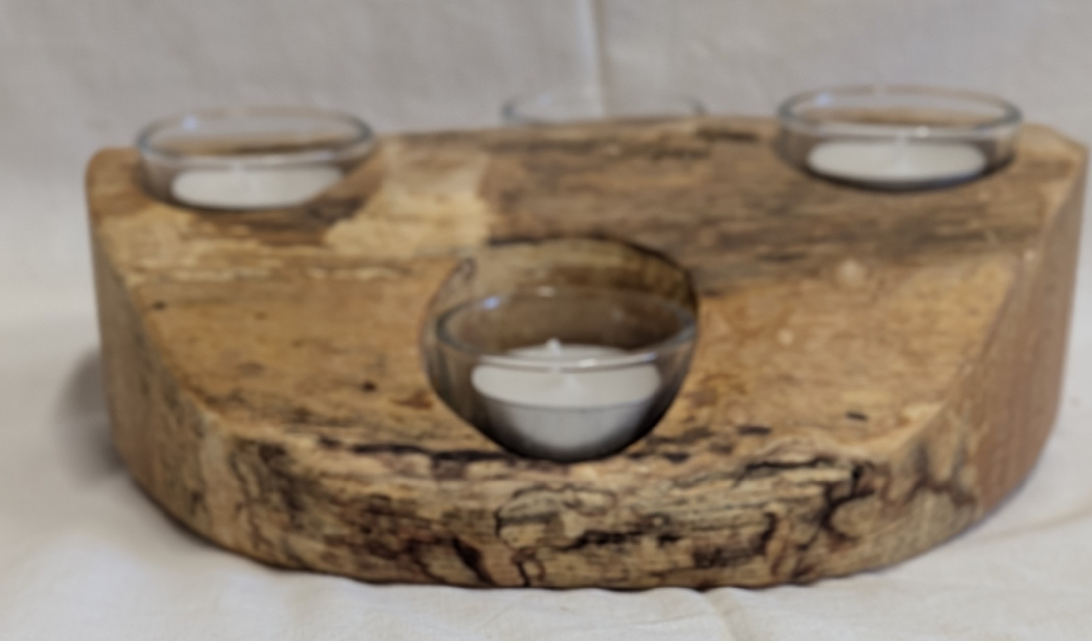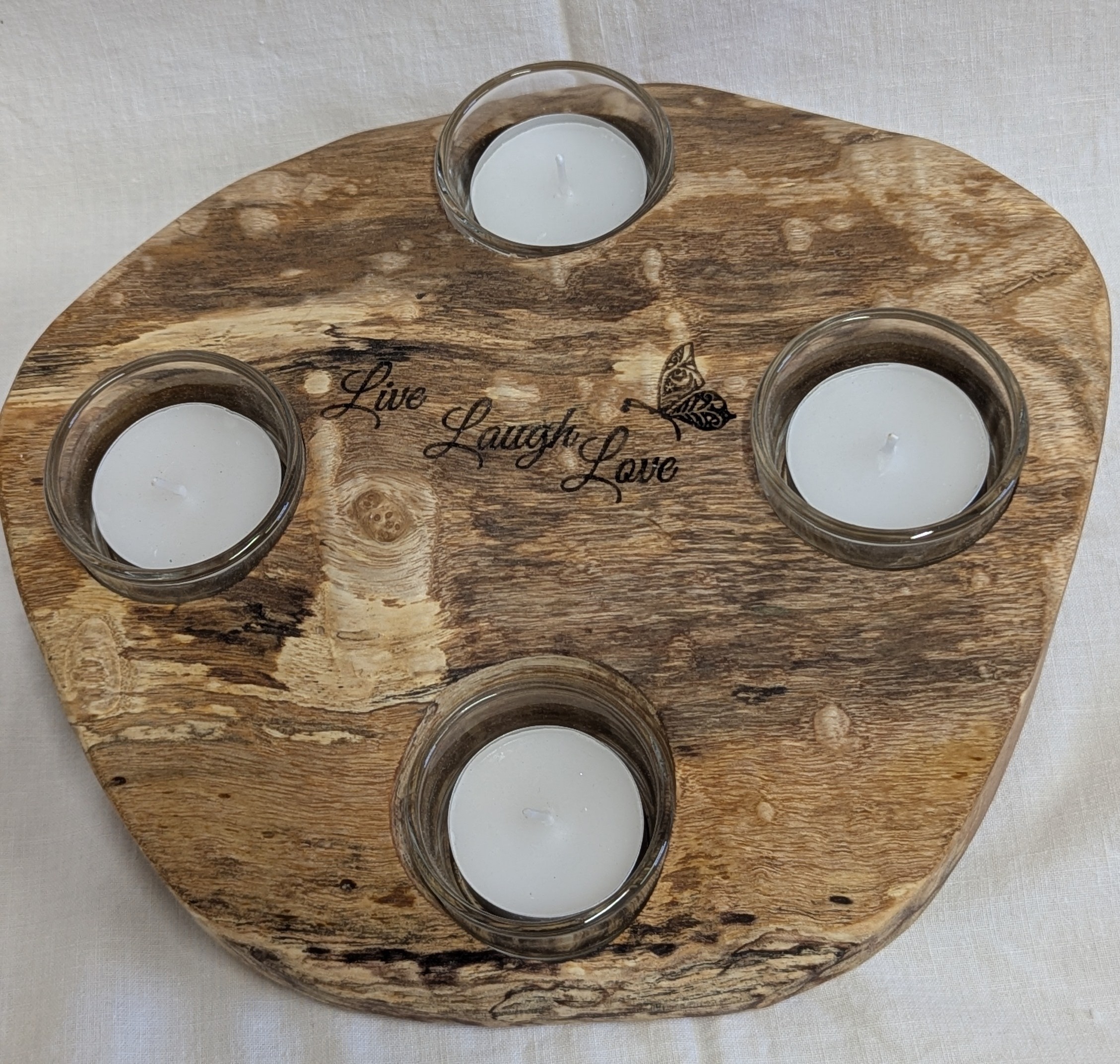 / Live, Laugh, Love Spalted Beech 4 Candle Tealight Holder. 230 x 60mm.